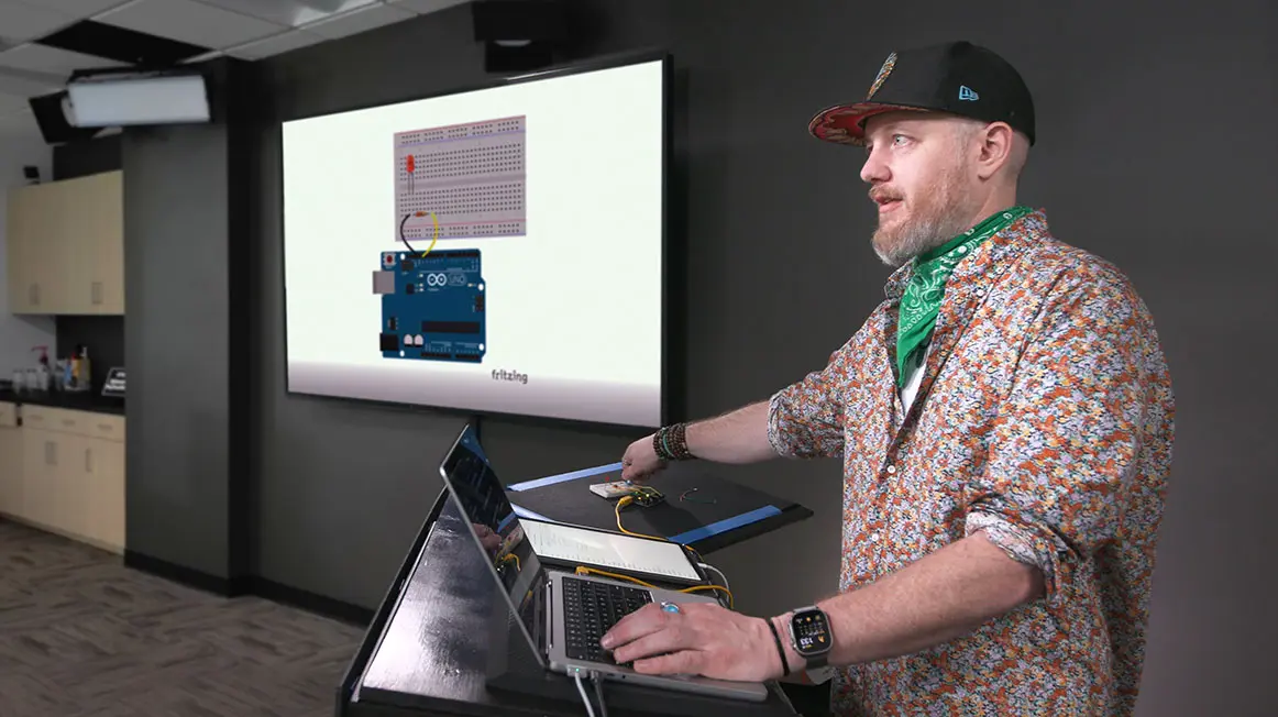 Steve asks students to wire an LCD screen to the Arduino. Once the LCD is wired and configured, the cursor method can move locations on the screen, and the print method will write a message at that location.