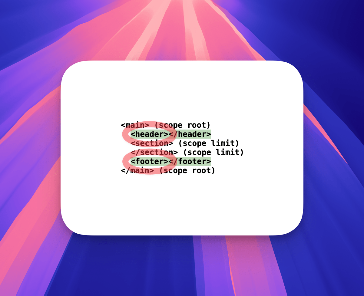 If needed, we can narrow the scope, or actually, stop the scoping at a particular second selector. In the example below I’ve added a ‘scope limit’ — specifically, I’ve defined the scope as from <main> (implicitly) to <section>. The scope is non-inclusive, so :scope > * selects the <header> and <footer> (excluding <section>, since it’s outside of the scope). main and section don’t select anything as, again, they’re out-of-scope, but we can continue to select <main> by using :scope: