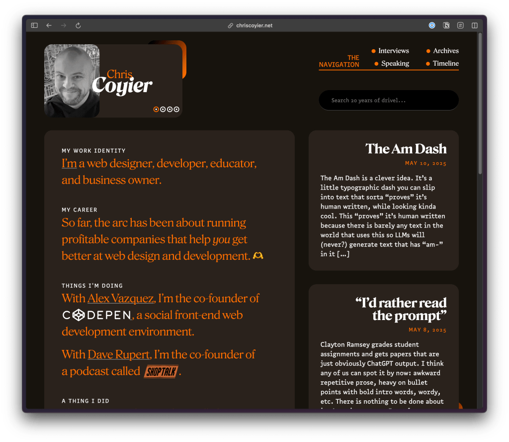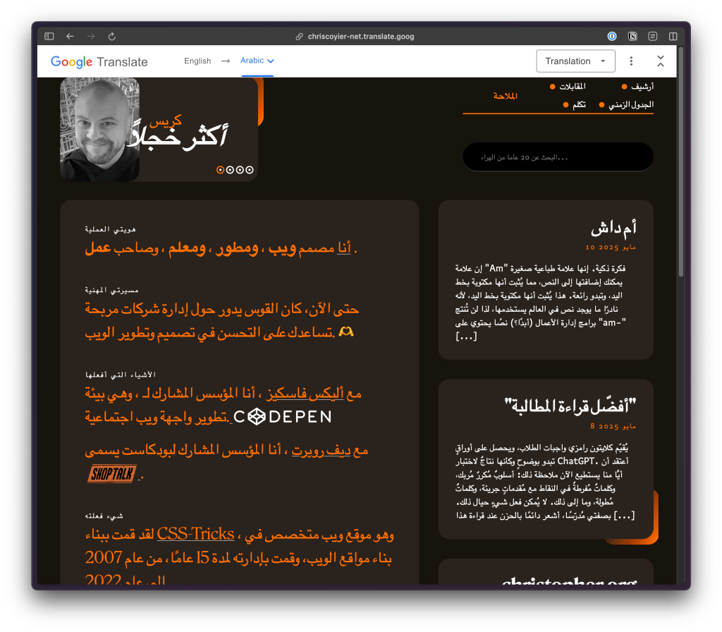 But let’s say you’re me (perfect, handsome) and you’ve changed your muscle memory for writing a lot of CSS properties to using logical properties. That is, stuff like padding-inline-start instead of padding-left, and the like. That, plus using layout like flexbox and grid, will reflow naturally with direction changes. So if you change the direction to rtl on my site, you get: