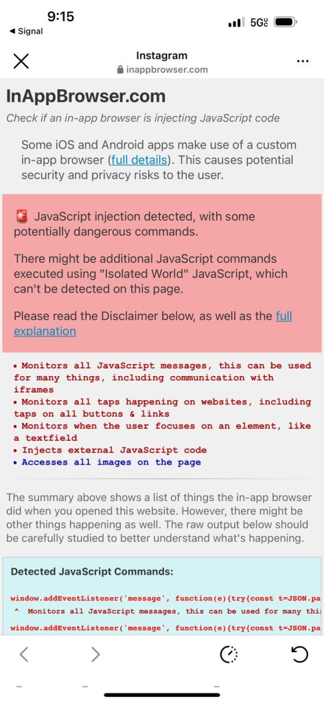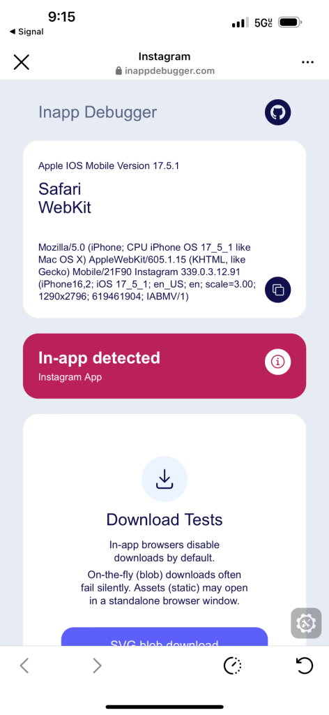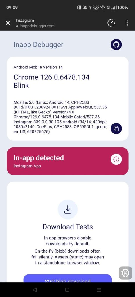 Let’s start with iOS. Below is iOS Instagram opening inappbrowser.com and inappdebugger.com in July 2024: