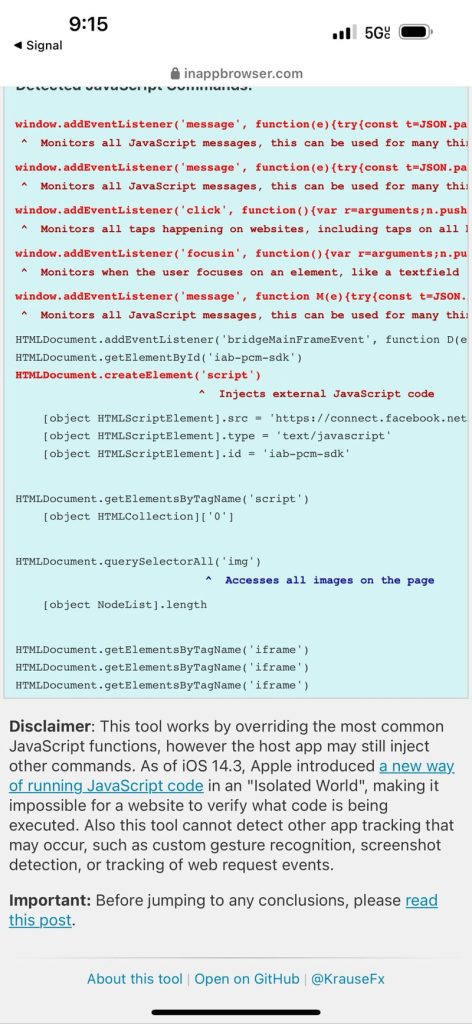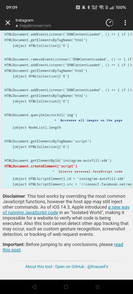 Three years later, in 2022, Felix Krause published two blog posts (1, 2) and a tool, inappbrowser.com, which focused on the privacy concerns of iOS apps. Initially this covered apps by Meta (Facebook, Messenger, Instagram) and then followed up with Android and other social media apps including TikTok. Felix’s findings supported Thomas’ from 3 years earlier and showed concerning findings from iOS Instagram: the arbitrary injection of a pcm.js script which Meta claimed to be an “event aggregator” but was also monitoring user interactions in the form of taps and selections. Further cause for concern was TikTok injecting JavaScript that monitors all keyboard inputs along with taps, which is effectively the functionality of a keylogger on third-party sites. TikTok acknowledged the existence of this code but claimed it’s only used for debugging, troubleshooting, and performance monitoring.