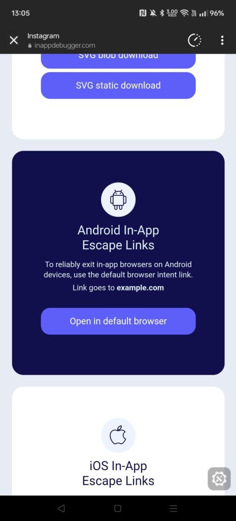 Let’s revisit the behavior of iOS & Android Instagram’s in-app browser at the time of this writing (July 2024). This is done by sharing the two testing links, inappbrowser.com and inappdebugger.com (we’ll discuss this one more shortly), in the app as a direct message or URL in your profile bio. This is so you can actually click on them, as Instagram prevents clickable URLs in places like the descriptions of posts.