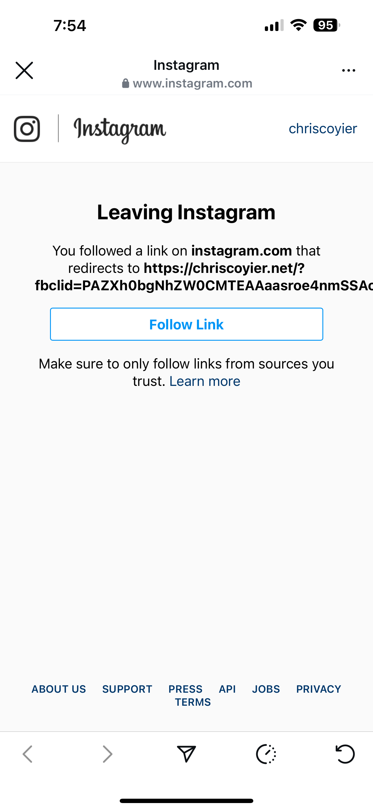 (Editor note: when testing this I noted that Instagram also appends URL parameters on outgoing links, which may be used to communicate additional information to this injected JavaScript).
