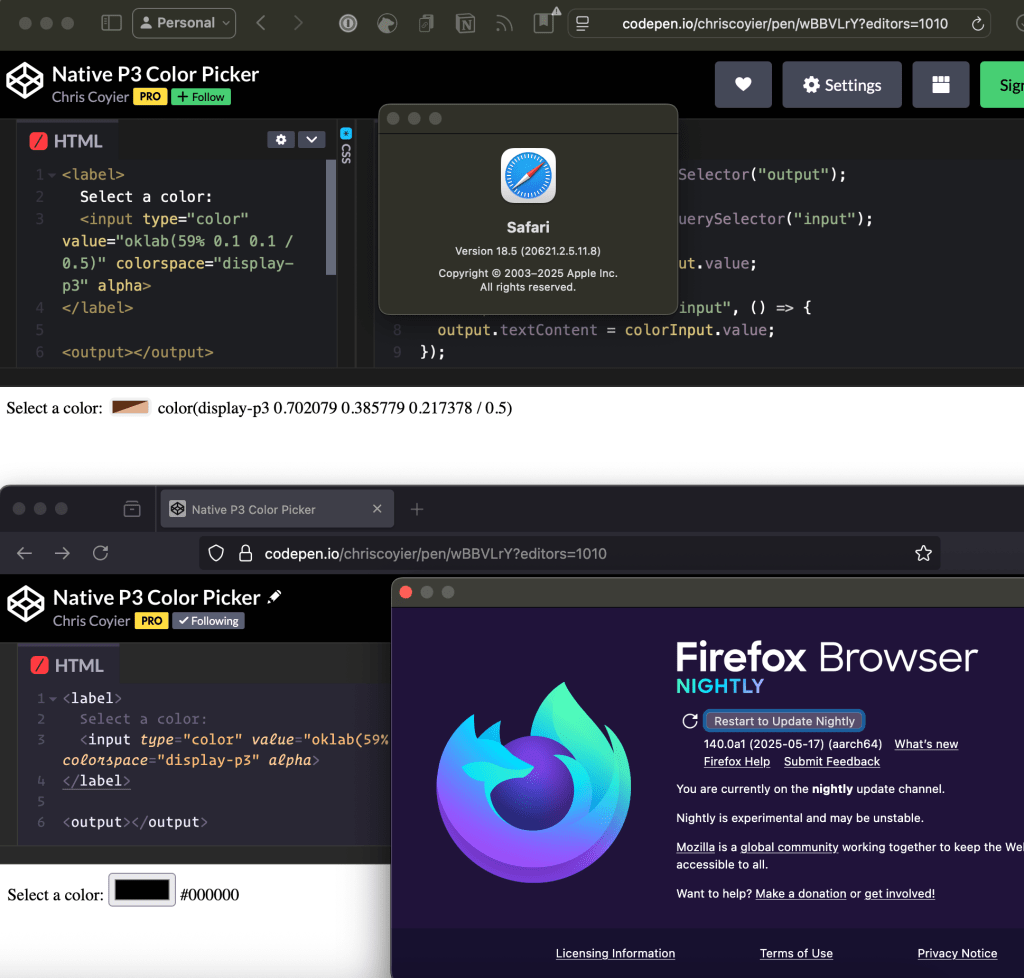 I just complained that color inputs couldn’t deal in P3 colors. Looks like Safari is the first-mover on supporting that, as well as alpha: