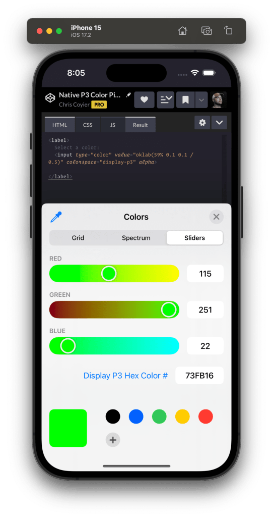 Under the Sliders tab, it’s still just R G & B, but it seems to me you can produce colors still in the P3 space. And if you’ve set the color space, it gives you a P3 hex code there (which I didn’t even know was a thing honestly). The actual value that you get is like: color(display-p3 0.921957 0.31855 0.969179). Which I guess is fine? Just don’t expect to get out a color in the same format you put in.