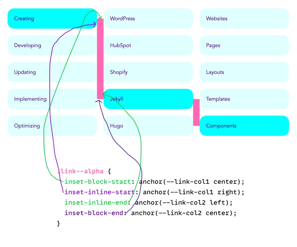 To link different elements in columns, my component relies on heavy JavaScript calculation. Here’s that example. While I love solving a math problem here and there, I prefer browsers doing these kinds of calculations for me!