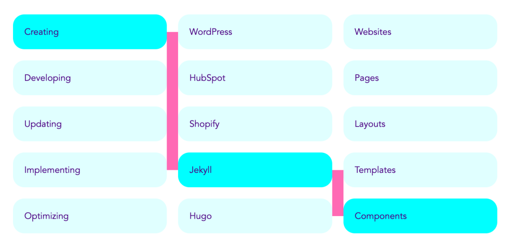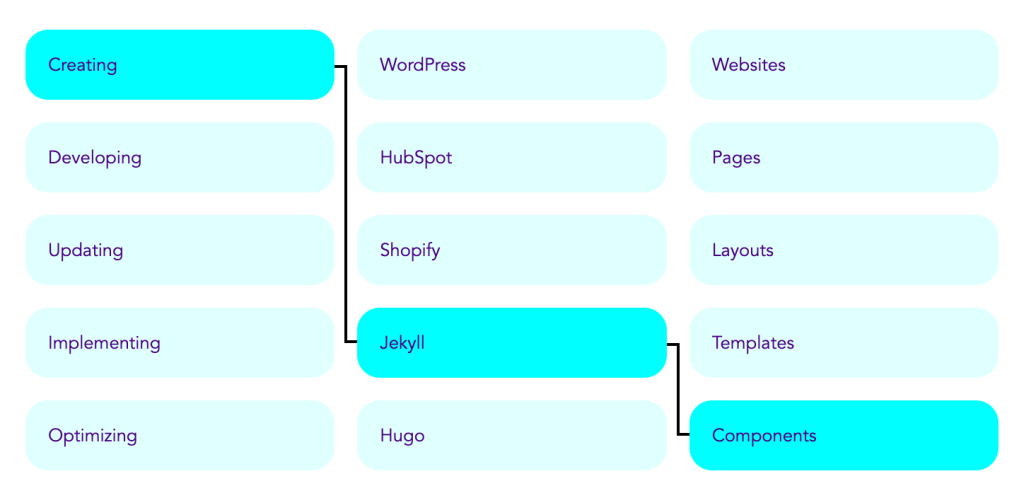 Back to my component. I have a three columns, and in each one I have a set of words which, when linked, form a new term. When you hover over any word, a random word in three different columns is highlighted and the final term is created. For example, “Creating WordPress Websites” or “Developing HubSpot Pages” or “Updating Shopify Layouts”. I thought it would be fun to showcase my skills in such a way. Here’s how the component works: