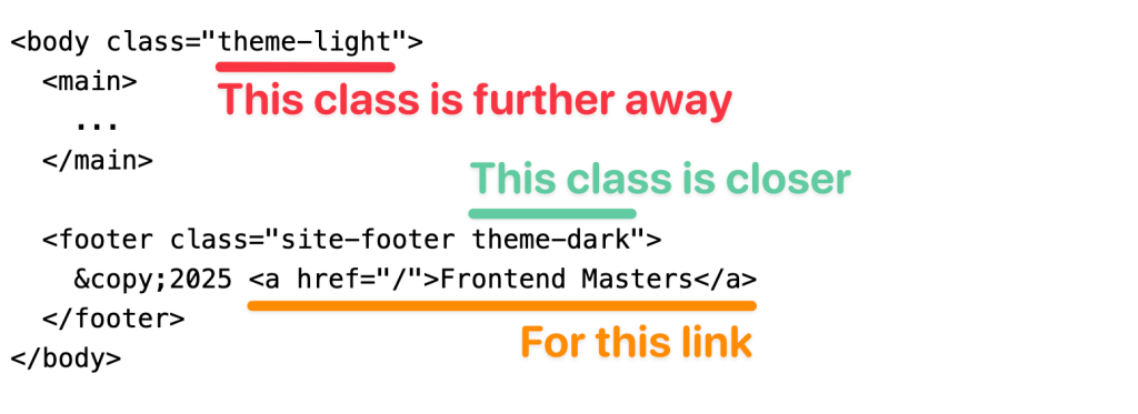 The <a> in the footer will have the color of the light theme, not the dark theme. This is that classic @scope demo you’re likely to see a lot (sorry). This is because of source order. The selector .theme-light a has the exact same specificity as .theme-dark a but the light theme comes after so it “wins”.
