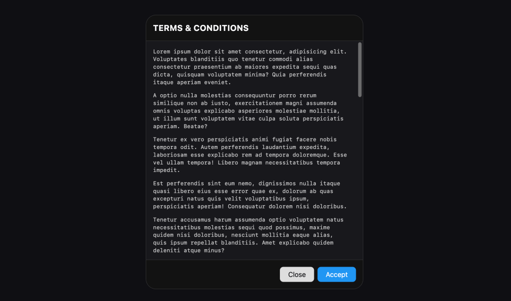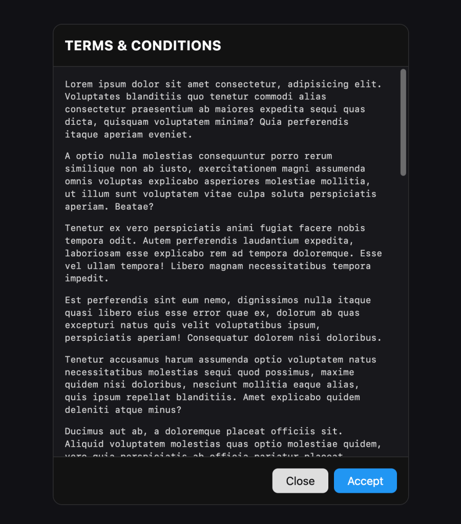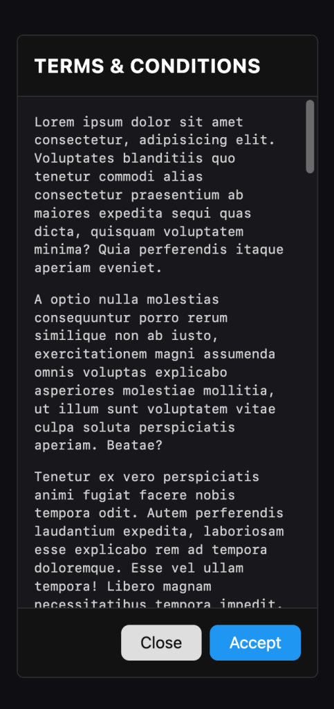 In our example, where a person needs to accept-or-not the Terms & Conditions, it’s likely modal is the better approach. That way what the person is trying to do can only continue if they accept or take a different path if they do not. This choice is likely required to know what to do next.